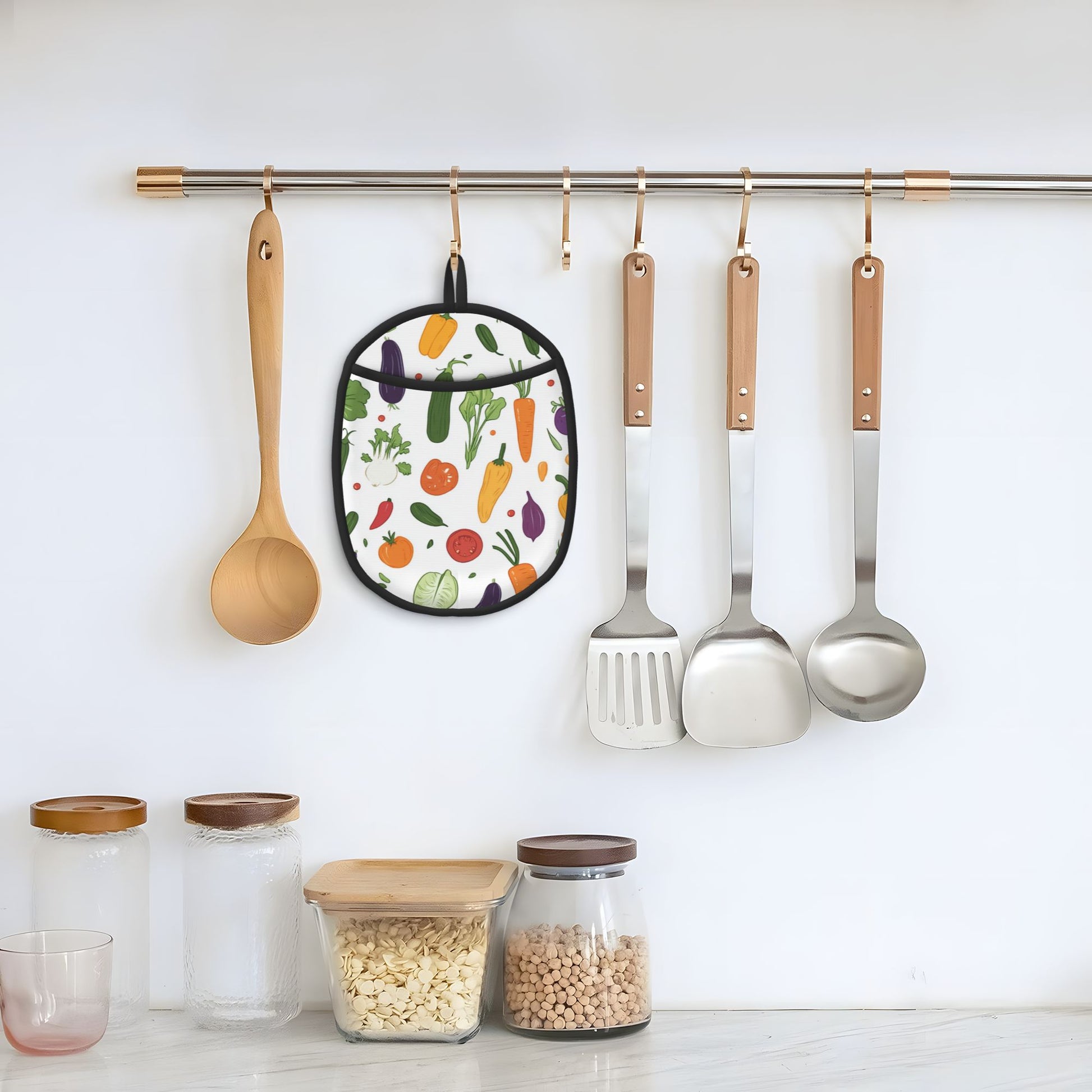 The front features vivid sublimation-printed illustrations of colorful vegetables, such as tomatoes, carrots, onions, eggplants, cabbage, and peppers, adding a playful, artistic charm. The reverse side is made from food-grade, high-density silicone with a textured anti-slip surface to ensure safety during use. Inside, a thick layer of heat-insulating cotton effectively blocks heat transfer and protects your hands.