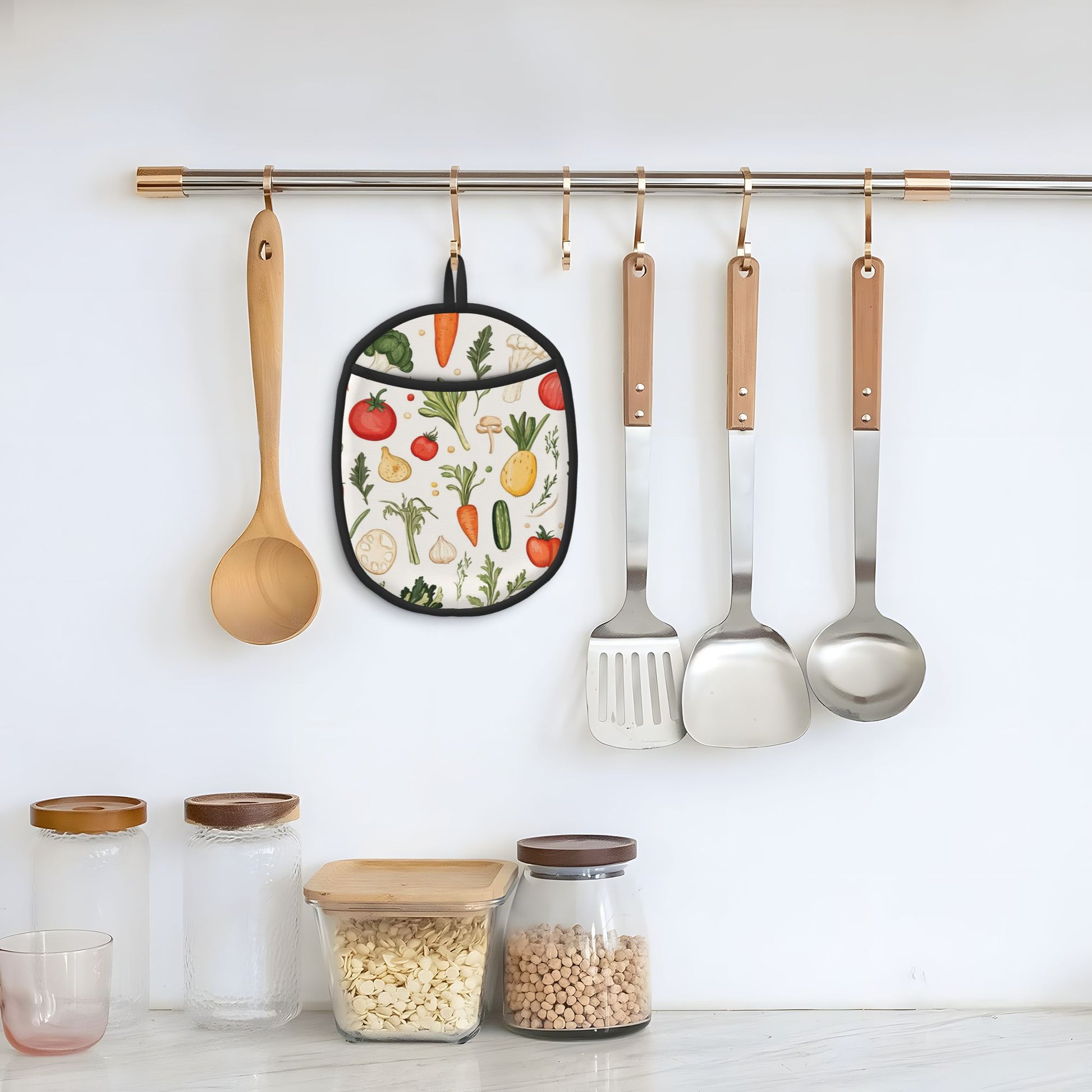 The front features a high-quality sublimation print of hand-drawn vegetables such as tomatoes, carrots, cucumbers, broccoli, celery, and more, bringing cheerful vibes to your culinary space. The back is made of food-grade, high-density silicone, providing excellent grip and resistance to heat. The thick padded inner layer ensures optimal insulation to protect your hands while handling hot cookware.