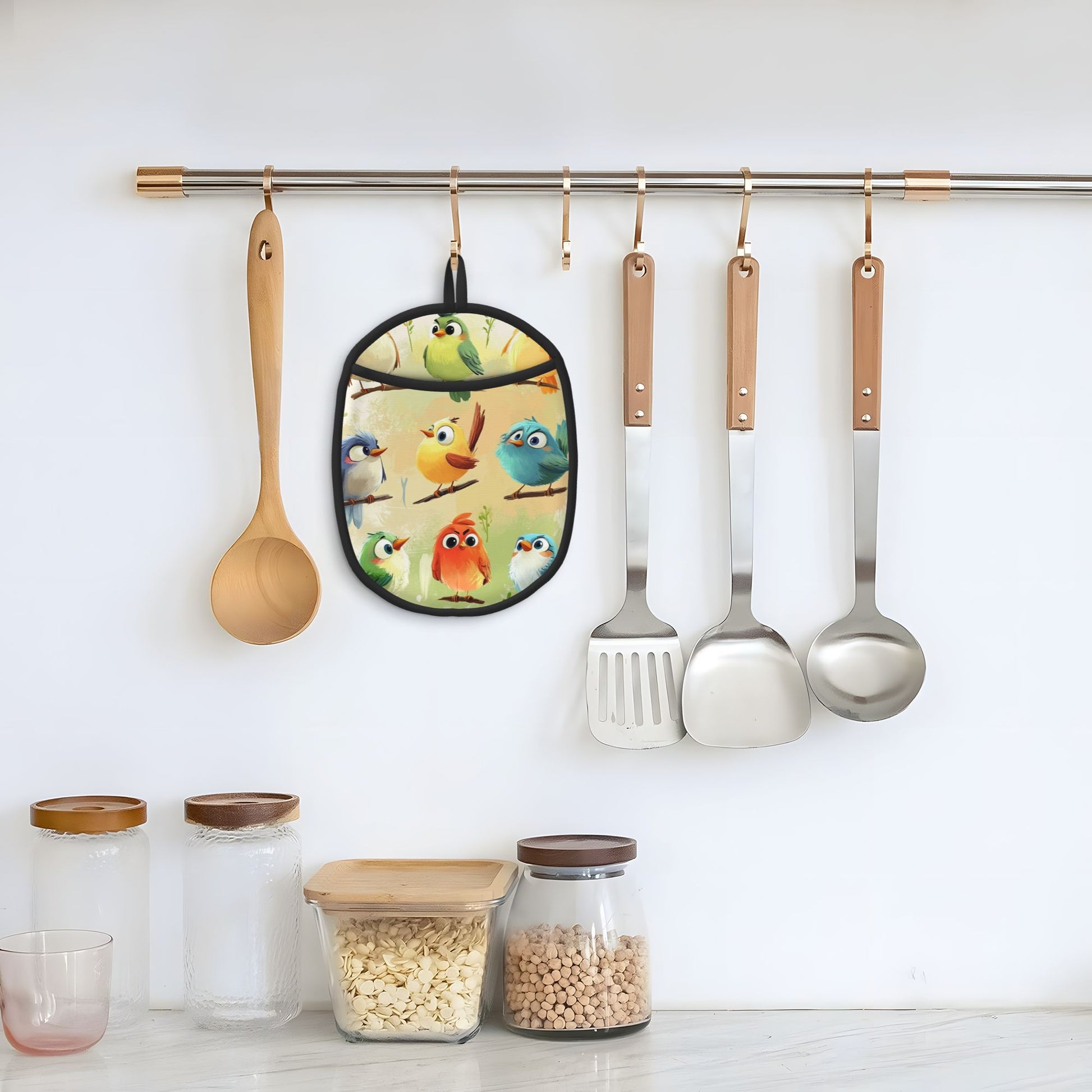 The front features a vibrant sublimation print with charming, animated bird illustrations that bring a smile to every cook’s face. Inside is filled with thick, heat-resistant cotton that shields your hands from high temperatures, while the back is made of food-grade, textured silicone that offers superior grip and non-slip protection.