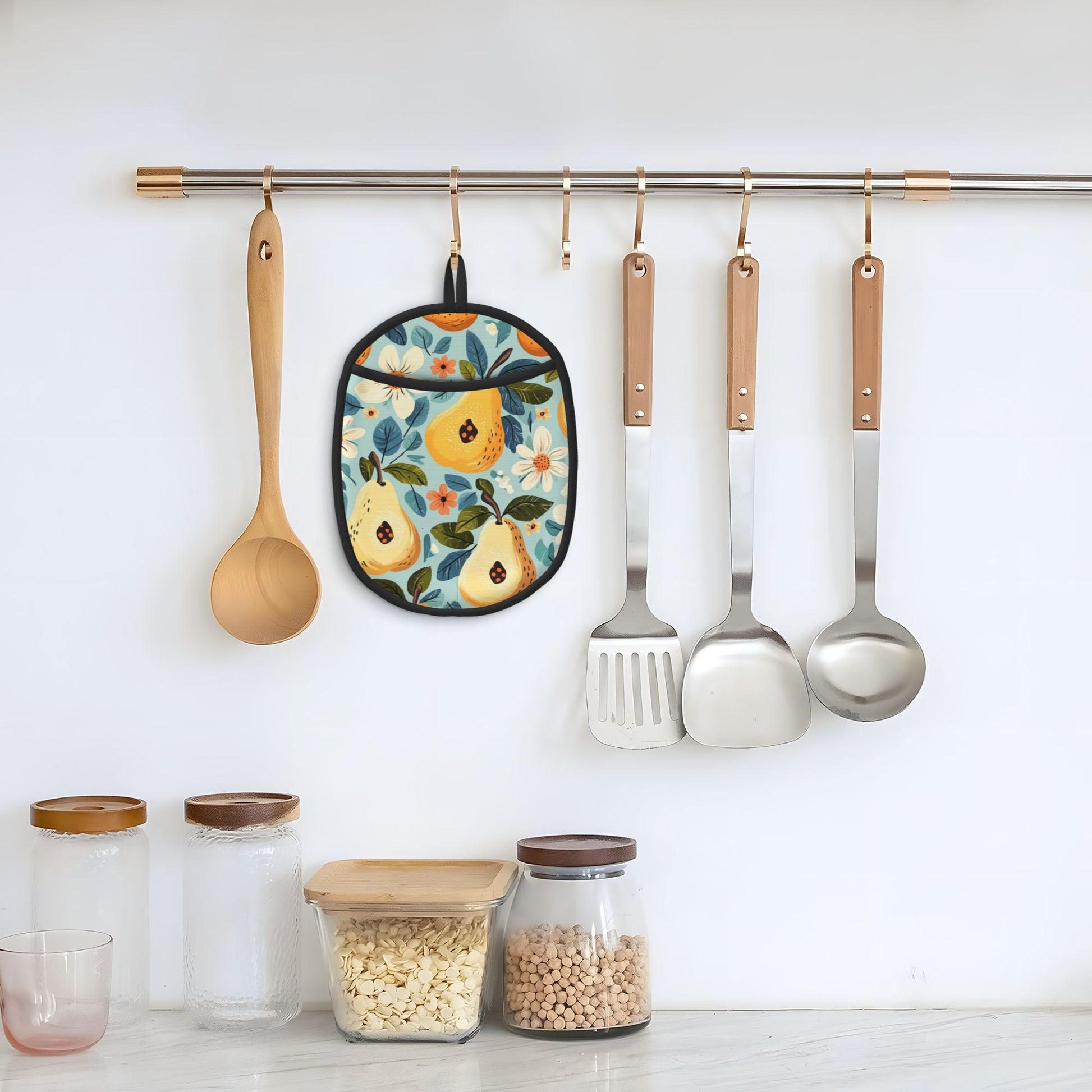 The pot holder features a convenient hanging loop for easy storage and organization. With vibrant sublimation printing, the design is both eye-catching and fade-resistant, making it a durable and decorative addition to any cooking space. The bright yellow pear pattern combined with floral elements evokes a fresh, cheerful kitchen vibe.